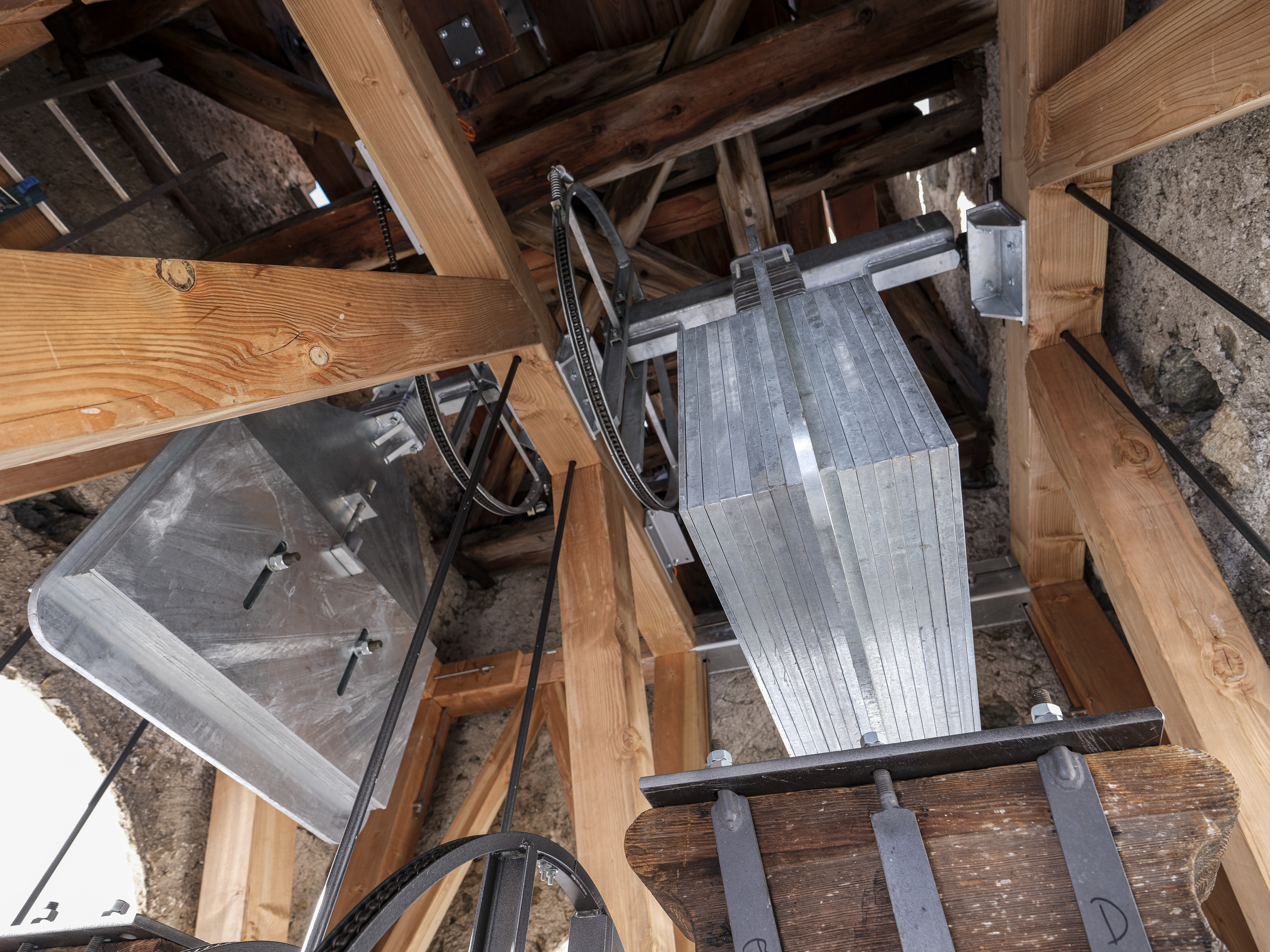 Auf Grundlage unserer Schwingungsmessungen war für Thomas Muff mit seinem Team und unserer Beratung rasch ersichtlich, dass sich das Problem nur durch die Installation einer Gegenpendelanlage für die beiden schwersten Glocken lösen lässt. Ziel dieser Anlage ist es, die von den Glocken auf den Kirchturm übertragenen Horizontalkräfte möglichst vollständig zu kompensieren. Dazu müssen für die beiden schwersten Glocken pendelnde Massen vorgesehen werden, die exakt in Gegenphase zu den Glocken schwingen. Eine der grössten Herausforderungen bestand daher darin, die beiden Gegenpendel im sehr begrenzten vorhandenen Raum unterzubringen.